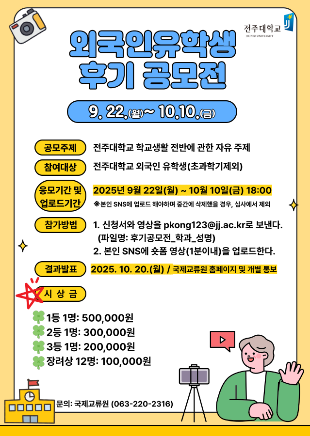 [ 전주대학교 2025 후기공모 프로그램 안내 ] 전주대학교에서의 대학 생활을 중심으로 한 소중한 경험을 함께 나누고자 영상 후기 공모전을 개최합니다. 여러분의 진솔한 이야기와 특별한 대학 생활 경험을 담은 영상을 기다립니다! ■ 공모 주제 수업, 한국 친구들과의 즐거운 경험, 수업 등 학교생활 전반에 대한 경험과 소감등 전주대학교 학교생활에 관한 자유주제 ■ 참여자격 전주대학교 외국인유학생 (초과학기 제외) ■ 응모기간 및 업로드기간 2025년 9월 22일(월) ~ 10월 10일(금) ※본인 SNS에 업로드 필수이며 중간에 삭제했을 경우, 심사에서 제외됩니다. 영상 콘텐츠 (자막)에는 한국어와 모국어가 모두 포함되어야 합니다. ■ 제출 방법 1. 첨부파일 신청서와 영상을 pkong123@jj.ac.kr로 보낸다 (파일명: 후기공모전_학과_성명) 2. 본인 SNS에 숏폼 영상(1분이내)을 만들어 업로드한다 ■ 시상 및 발표 1등 1명: 500,000원 2등 1명: 300,000원 3등 1명: 200,000원 장려상 12명: 100,000원 - 발표: 2025. 10. 20.(월) / 국제교류원 홈페이지 및 개별 통보 ■ 유의 사항 제출된 작품은 반환하지 않으며, 학교 홍보 자료로 활용될 수 있습니다. 표절, 모방 등 부정행위가 확인될 경우 수상이 취소됩니다. 여러분의 소중한 이야기를 기다립니다. 많은 관심과 참여 부탁드립니다! 🙌 문의: 전주대학교 국제교류원 (063-220-2316) |