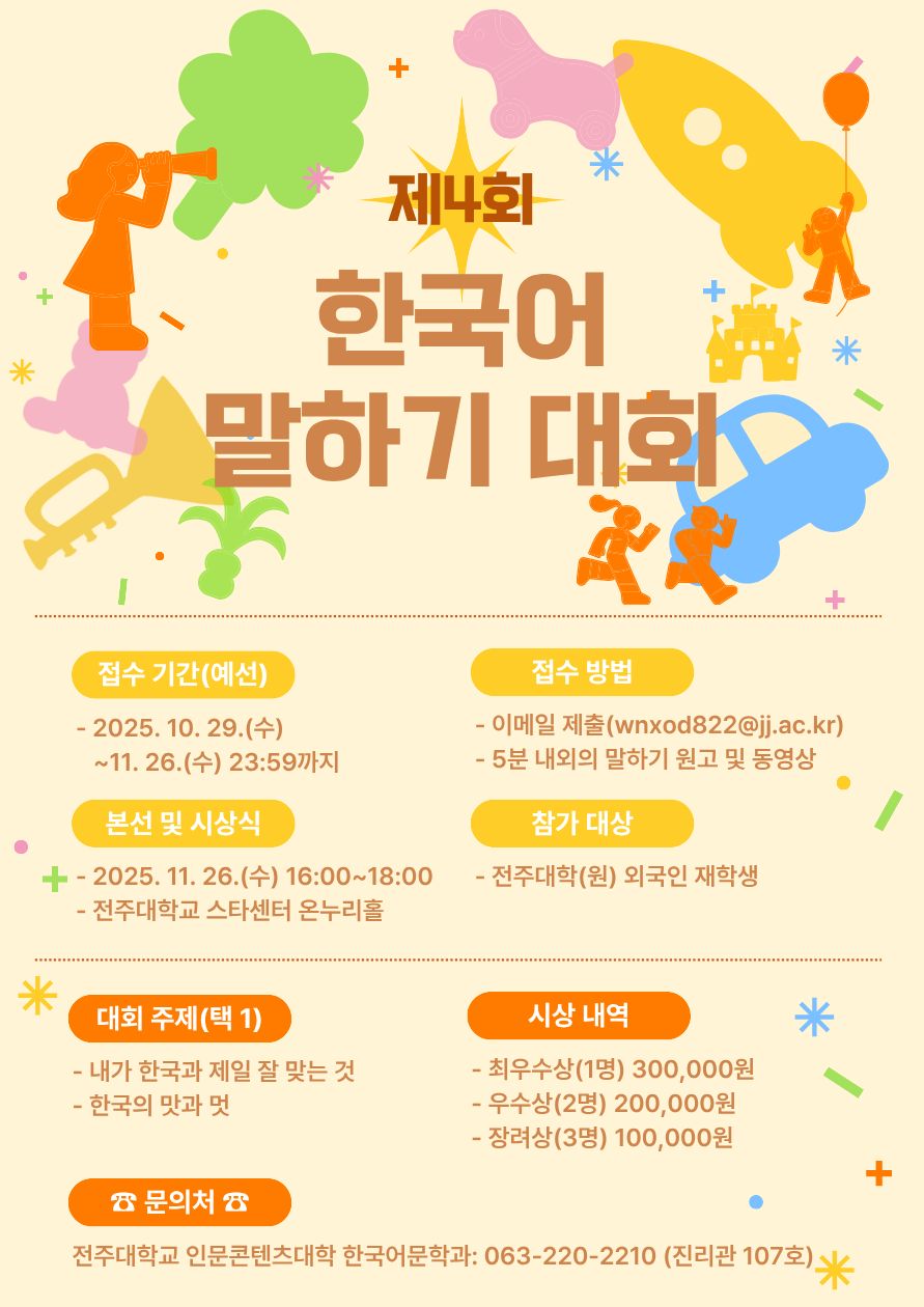 👱제4회 한국어 말하기 대회 안내👱 📆 접수기간(예선) 📆 2025. 10. 29.(수)~11. 12.(수) 23:59까지 💻 접수 방법 💻 5분 내외의 말하기 원고와 동영상을 이메일로 제출 (이메일: wnxod822@jj.ac.kr) 🔊 본선 및 시상식 2025. 11. 26.(수) 16:00~18:00 / 스타센터 온누리홀 🙋 참가 대상: 전주대학(원) 외국인 재학생 🗂 대회 주제: 내가 한국과 제일 잘 맞는 것/ 한국의 맛과 멋 중 택 1 💰시상 내역: 최우수상(1명) 30만원 / 우수상(2명) 20만원 / 장려상(3명) 10만원 ☎ 문의처: 한국어문학과 사무실(063-220-2210) / 진리관 107호 |