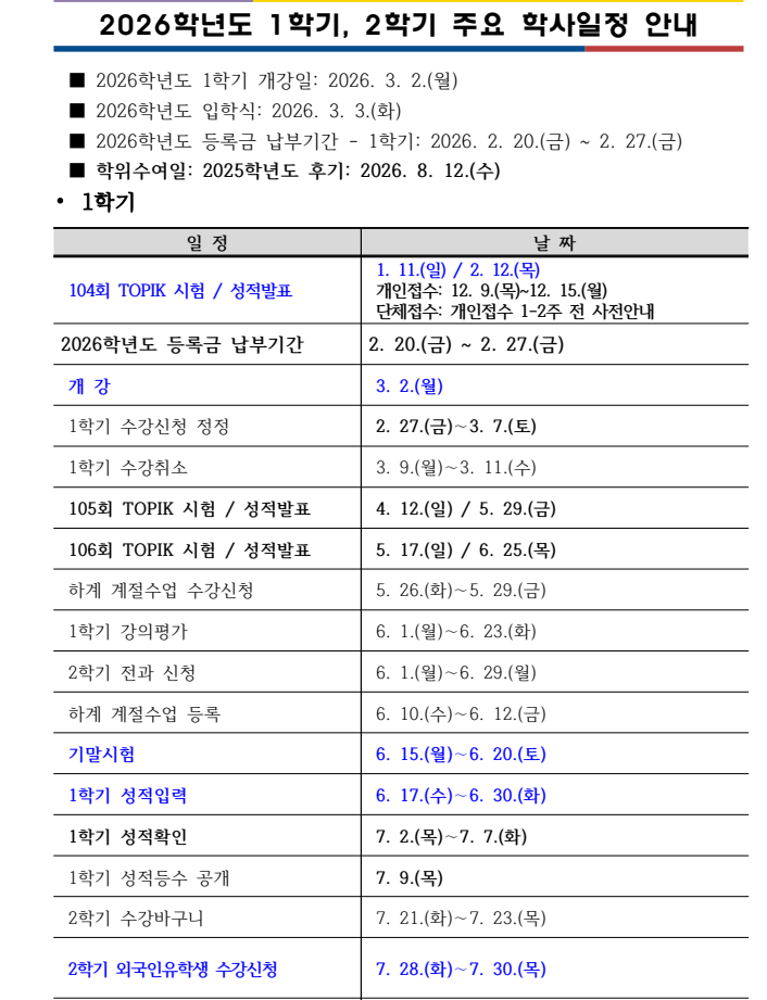 | 전주대학교 2026학년도 외국인유학생 「1학기, 2학기 주요 학사일정」 안내 |