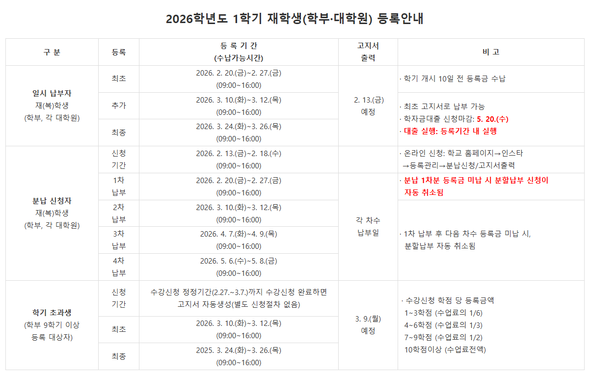 2026학년도 1학기 재학생 등록 기간을 아래와 같이 안내드립니다. 유학생분들은 참고 하신 후, 각 기간에 맞춰 등록금을 납부해주시기 바랍니다.