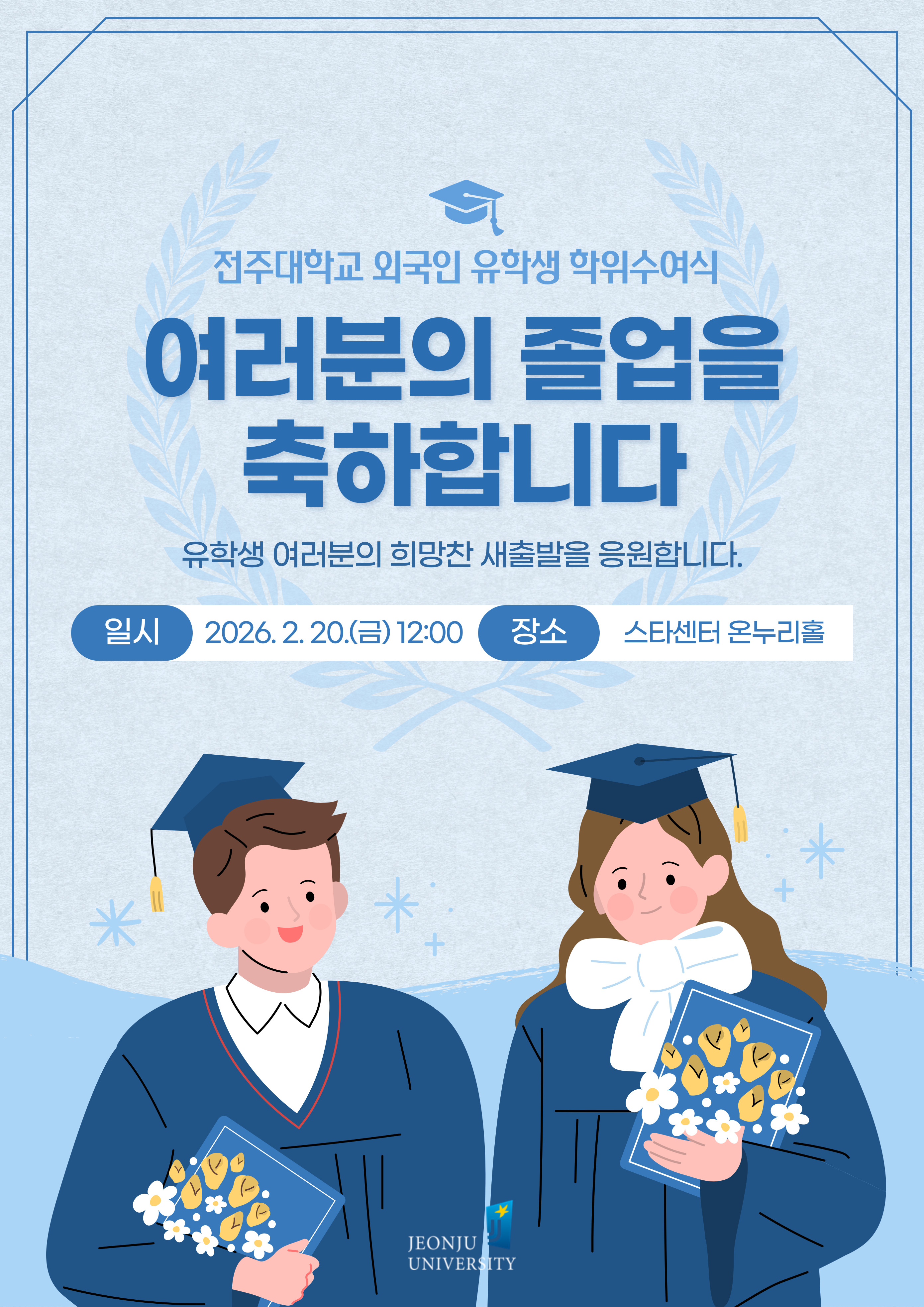 전주대학교 국제교류원에서는 4년간 유학생활을 마무리 하고 새로운 출발선에 선 유학생들을 위해 「2025학년도 전기 외국인 유학생 학위수여식」을 개최하고자 합니다. 뜻깊은 자리에 참석하시어 유학생들의 새로운 시작을 함께 축하해 주시면 감사하겠습니다 💗 🎀일시: 2026. 2. 20.(금) 12:00 🎀 장소: 스타센터 온누리홀 |