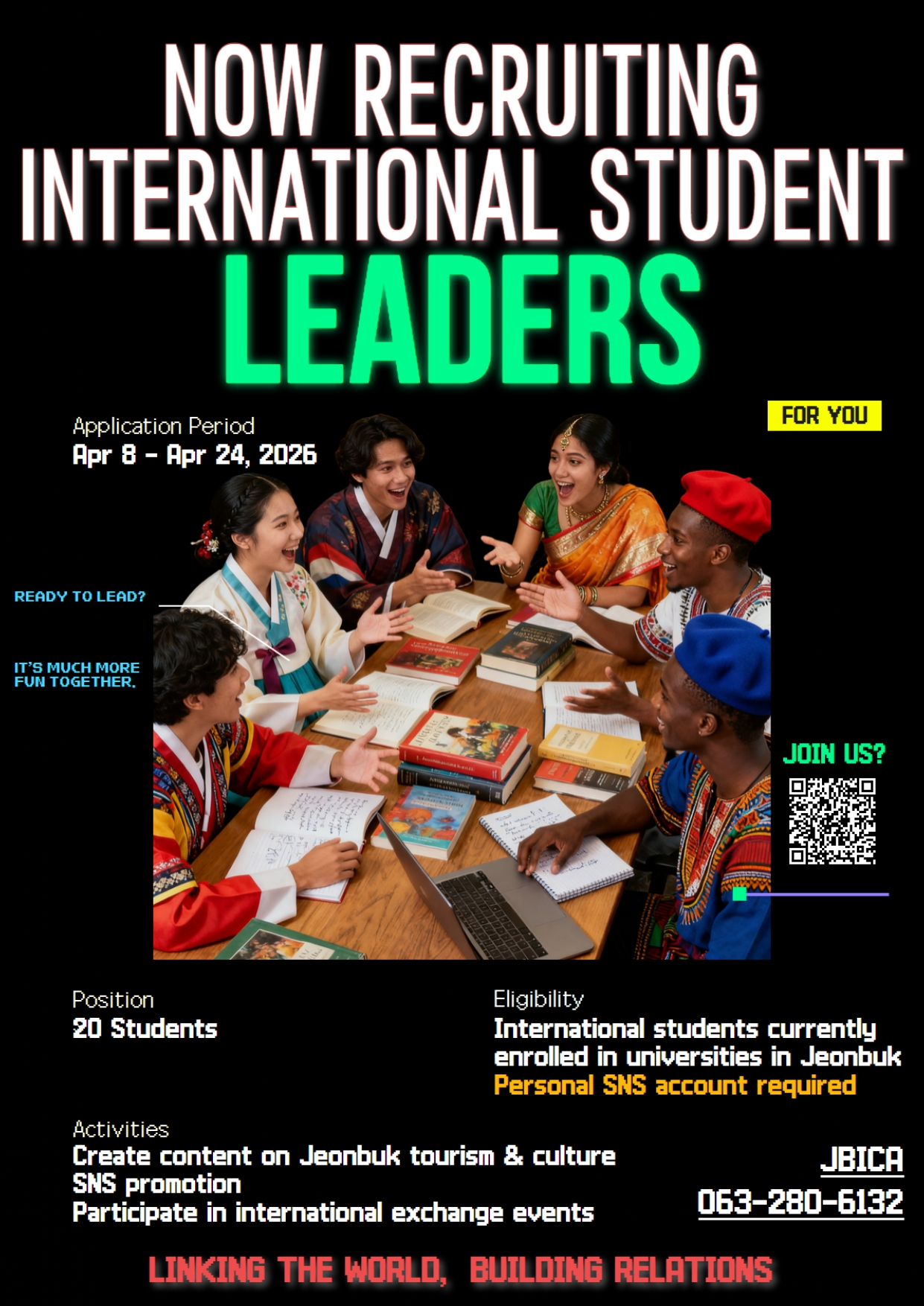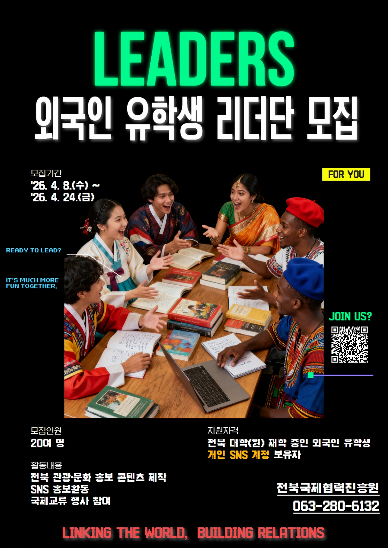 (재)전북국제협력진흥원에서 유학생의 안정적인 정착과 유학생의 네트워크 활성화를 위해 아래와 같이 「외국인 유학생 리더단」을 모집한다고 합니다 ! 지원 자격을 확인하고 관심 있는 학생들은 첨부 파일을 확인하여 신청서를 제출해주세요! ٩( *˙0˙*)۶ [신청방법] ■ 접수기간: 2026. 4. 8.(수)~4. 24.(금) ■ 접수방법: 이메일 접수(che2023@jbica.kr) ■ 제출서류: "첨부파일" 확인 ① 외국인 유학생 리더단 지원서 1부 ② 개인정보 수집·이용·제공 동의서 1부 ③ 콘텐츠 수집·이용·제공 동의서 1부 ※ 제출서류는 하나의 파일(PDF 등)로 취합하여 제출 |