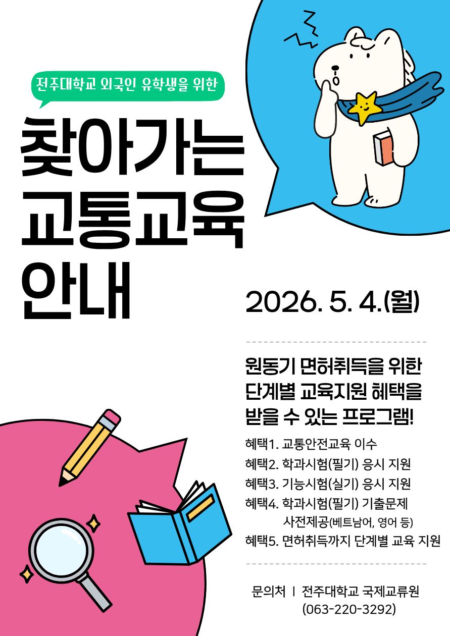 ✅️ 면허종류: 원동기 면허 ✅️ 교육 및 시험일: 2026. 5. 4.(월) 12:00~18:00 *운영 시간은 사정에 따라 변동이 있을 수 있습니다. ✅️면허 취득 절차 교통안전교육 1시간(13:00) → 신체검사(시험장 내) → 학과시험 → 기능시험(16:00~) → 면허증 발급 💗학생 준비 사항💗 1. 안전교육 수강신청서(국제교류원 사무실 방문하여 작성) 2. 최근 6개월 이내 촬영한 반명함 증명사진 3장 (응시원서용 2장+면허발급 1장) 3. 신분증(외국인 등록증) 4. 신체검사비용 약 6,000원 찾아가는 교통안전교육 프로그램을 신청한 학생들은 학과시험 기출문제를 다운받아 열심히 공부해주세요 ! ٩( *˙0˙*)۶ 기출문제는 국문 / 영문 / 중문 / 베트남어로 구분되어 있습니다! ☎️문의처☎️ 담당자 | 국제교류원 신호경(063-220-3292) |