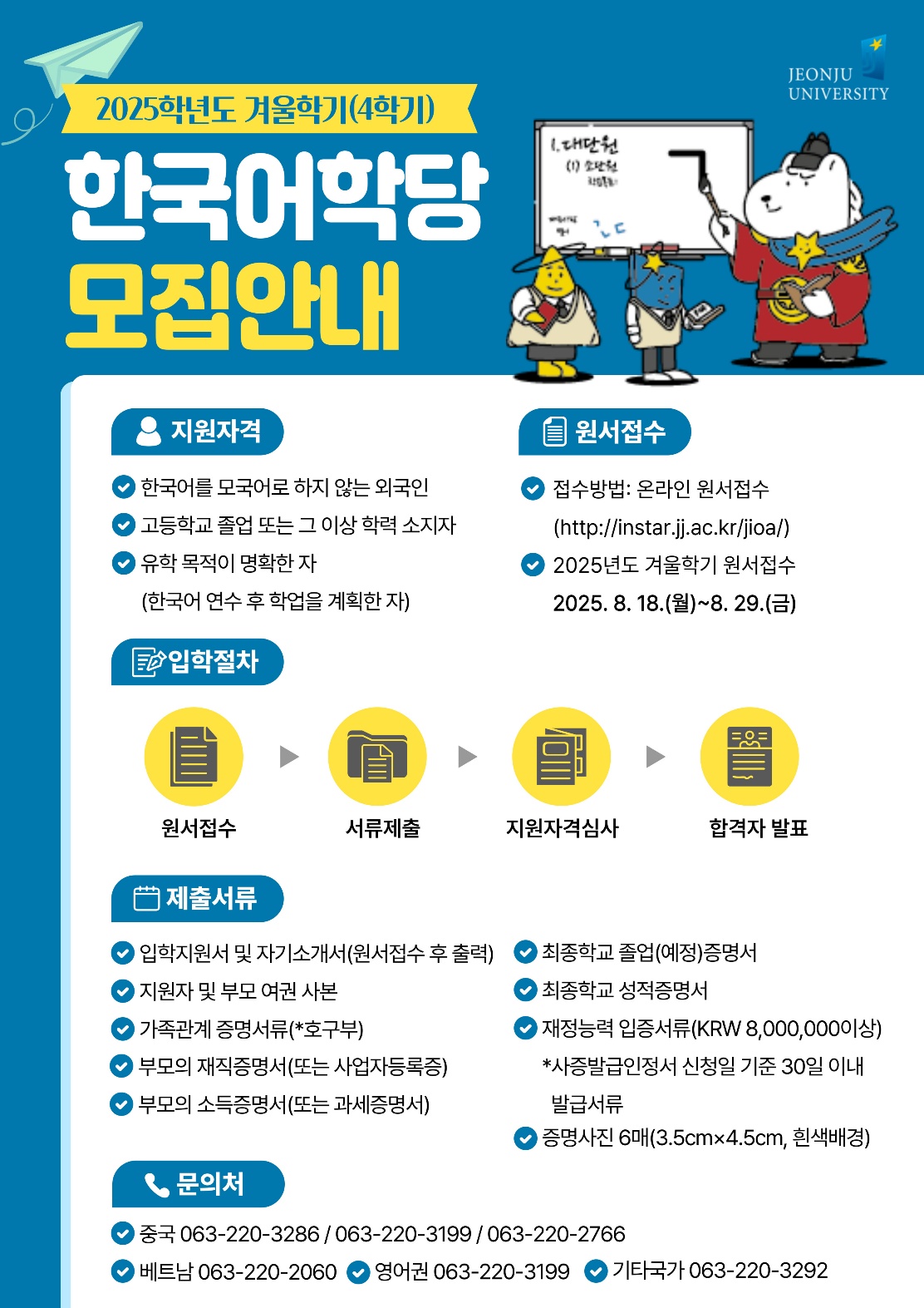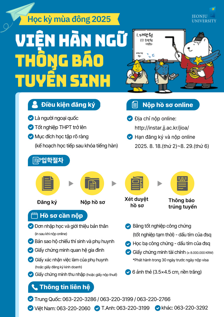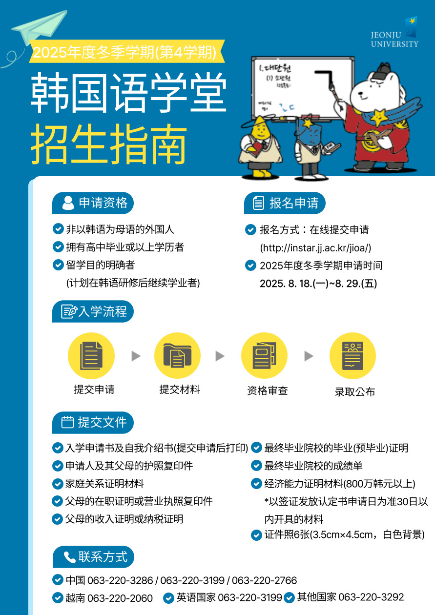 전주대학교 한국어학당에서는 2025학년도 겨울학기(4학기) 연수생을 아래와 같이 모집합니다. 전주대학교 한국어학당은 학부 및 대학원 진학을 목표로 하는 학생들이 실용적이고 균형 잡힌 한국어 능력을 갖출 수 있도록 체계적인 교육을 제공합니다. 또한, 최적의 교육 환경과 다양한 프로그램을 통해 유학생들의 원활한 한국 생활 적응을 돕고, 성공적인 한국어 학습을 지원하고자 합니다.